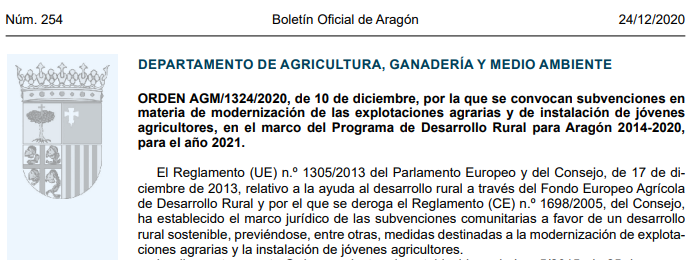 Mediante la Orden AGM1324/2020, de 10 de diciembre, del Consejero de Agricultura, Ganadería y Medio Ambiente, publicada en el BOA número 254, de 24 de diciembre de 2020, se convocaron subvenciones en materia de modernización de las explotaciones agrarias y de instalación de jóvenes agricultores, en el marco del Programa de Desarrollo Rural para Aragón 2014-2020, para el año 2021.
